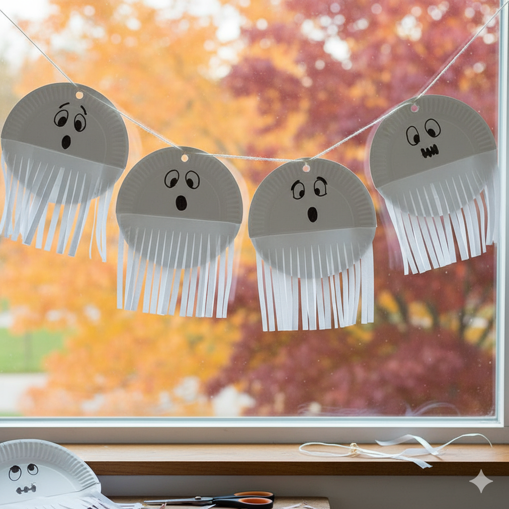 - Navodila: Papirnate krožnike preprosto polepite na polovico in na eno stran narišite prestrašene ali jezno duhovske obraze. Iz spodnjega dela izrežite tanke trakove (nogice duha) in ga preluknjajte na vrhu. Skozi luknjo napeljite vrvico in jih obesite na strop ali lestenec.