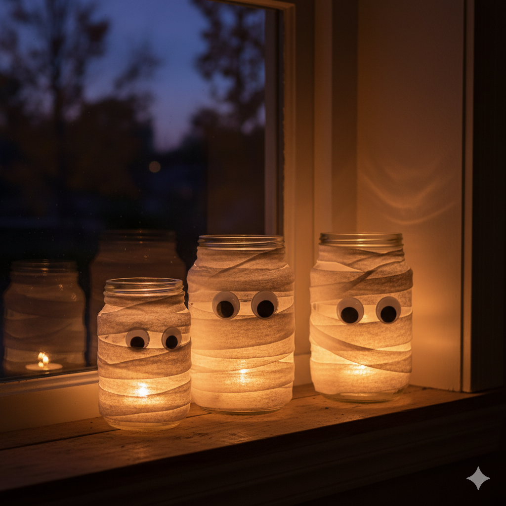 - Navodila: Otroci naj kozarce premažejo z lepilom (ali lepilnim trakom) in nato ovijejo z gazo/papirnatimi trakovi, da ustvarijo videz múmije. Pazite, da pustijo majhne reže. Na sprednjo stran prilepite gibljive oči. Ko je vse suho, vanje namestite LED lučke.