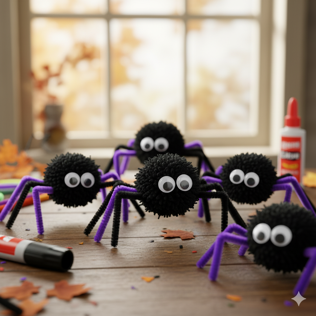 - Navodila: Otroci naj s pomočjo kartonastega kroga ali vilic naredijo črne cofke iz volne (ali uporabite že kupljene cofke). Na cofke nalepite oči. Čistilce za pipe prerežite na pol in jih 8 (ali kolikor jih želite) prilepite na spodnjo stran cofka kot pajkove noge.